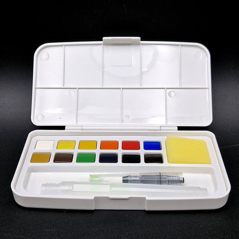 Set de acuarelas en pastilla sólida con 12 colores surtidos, formulados con pigmentos de buena solubilidad y secado rápido. La presentación en estuche plástico compacto incluye tapa con compartimentos que puede usarse como paleta de mezcla. Apta para ilustración y trabajos artísticos básicos sobre papel adecuado para acuarela. Se activa fácilmente con agua y permite aplicar capas transparentes o superpuestas. Recomendado para estudiantes, principiantes y actividades creativas.
