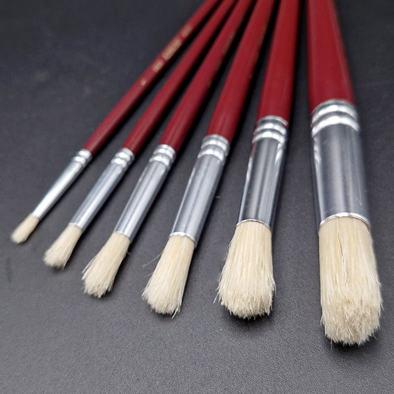 Pincel de cerda, forma redonda con extremo redondeado, de grosor uniforme, y mango largo, diseñado para técnicas con óleo y acrílico. Su punta redondeada permite trazos suaves y controlados, ideal para aplicar pintura de manera consistente. Las cerdas duras sostienen bien el medio, facilitando capas con cuerpo y efectos empastados. El mango largo brinda comodidad y amplitud de movimiento, resultando perfecto para trabajos sobre caballete o lienzos grandes. La virola metálica garantiza la fijación segura del pelo.